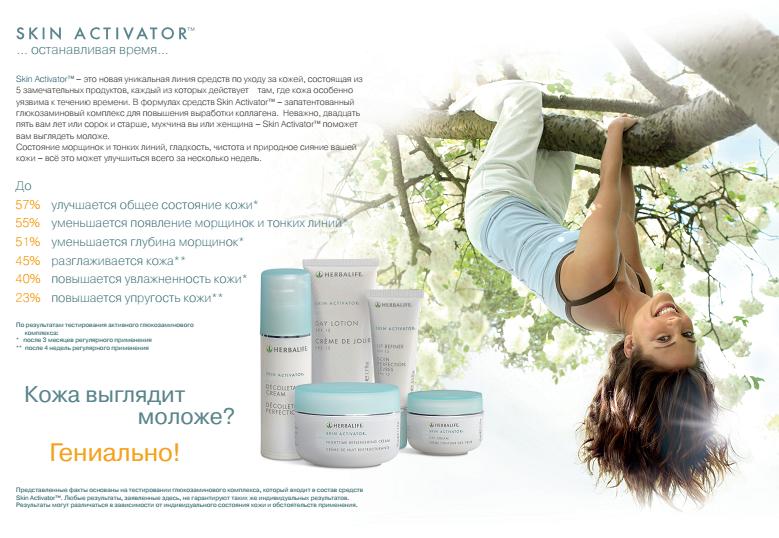 Технология глюкозамина была применена Гербалайф при разработке революционной линии средств для ухода за кожей Skin Activator™.Средства этой линии стали хитом продаж в разных странах. Почему? Потому что технология глюкозамина действует мощно и, вместе с тем, нежно, не давая побочных эффектов, в отличие от других модных косметических технологий. Тысячи женщин и мужчин (ведь старение кожи - это процесс, который беспокоит не только женщин) уже оценили действие этих кремов, которые невозможно не заметить.Skin Activator-косметика для омоложения и сохранения кожи.Начиная с 25 лет, выработка природного коллагена уменьшается примерно на 1,5% в год, вследствие чего кожа теряет эластичность, появляются морщины и другие признаки старения. Средства Skin Activator™ содержат уникальный запатентованный глюкозаминовый комплекс, способствующий выработке коллагена. Пять компонентов, чтобы выглядеть на 10 лет моложе. Для любого типа кожи. Для мужчин и женщин от 25 и старше.