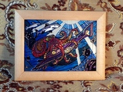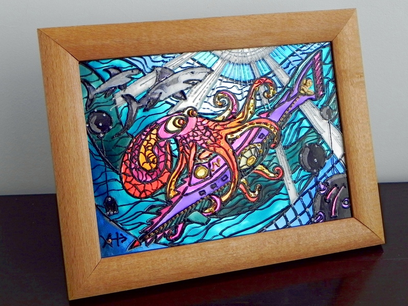 Серия «Зазеркалье»: Подводная схватка Размер живописного поля: 130 х 180 (мм) Витражная картина выполнена витражными красками и контурами по стеклу. Необычное фольгированное стекло-основа даёт восхитительный оптический эффект яркого блеска изображения в отражённом свете! К сожалению, фото не передаёт этот феномен:( Только человеческий глаз способен оценить подобное. По мотивам романа Жюль Верна: Подводная лодка "Наутилус" побеждает в подводной схватке. Океан полон опасностей, но смелый всегда победит! Любителям фэнтези и морякам-подводникам:) будет хорошим и нетривиальным подарком этот витраж. Деревянная рамка органично вольётся в привычный мебельный интерьер.Доставка- Новая почта или самовывоз. |
