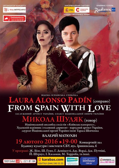 В концертном зале СБУ, ул. Ирининская,6, ст. м. Золотые Ворота 19 февраля 2016 г. в 19-00 состоится концерт «From Spain with Love» при участии всемирно известной испанской оперной певицы Laura Alonso Padin (Лауры Алонсо Падин) и заслуженного артиста Украины, солиста Национальной оперы Украины - Николая Шуляка. Артисты выступят в сопровождении одного из ведущих высокопрофессиональных оркестров Украины, национального ансамбля солистов «Киевская Камерата», под руководством лауреата Национальной премии Украины имени Т. Шевченко, народного артиста Украины – Валерия Матюхина. Слушателей ожидает яркая красочная программа, в которой представлены известные оперные арии Дж. Верди, Ж. Бизе, Г. Доницетти, зажигательные арии из оперетт Й. Штрауса, Ф. Легара, И. Кальмана. Экзотический испанский колорит привнесет сарсуэла - жанр близкий к оперетте, а неаполитанская песня очарует своей мелодичностью и шармом итальянского бельканто.