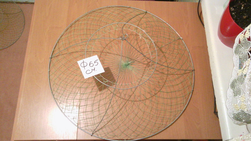 Размеры: диаметр нижнего кольца – 65 см., верхнего кольца – 30 см., кольца сделаны из нержавеющей проволоки. Материал сетеполотна – капрон.