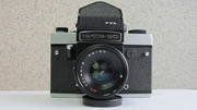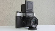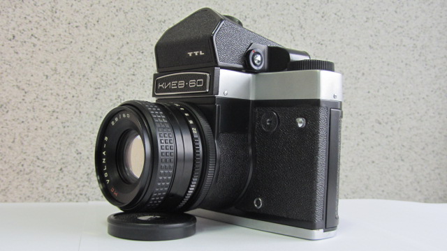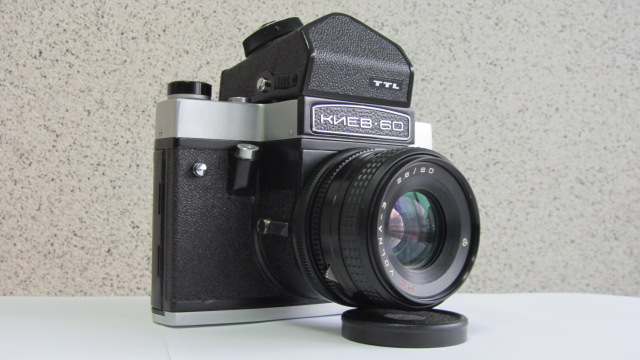 ФОТОАППАРАТ Киев-60 TTL —среднеформатный зеркальный фотоаппарат с форматом кадра 6x6 см системы TTL. Рассчитан на применение катушечной не перфорированной фотопленки шириной 60 мм (тип 120). При использовании этой пленки получается 12 кадров,но и роликовую пленку 220 на 24 снимка такого же формата. Тем самым отпадает необходимость в каждой второй зарядке камеры.