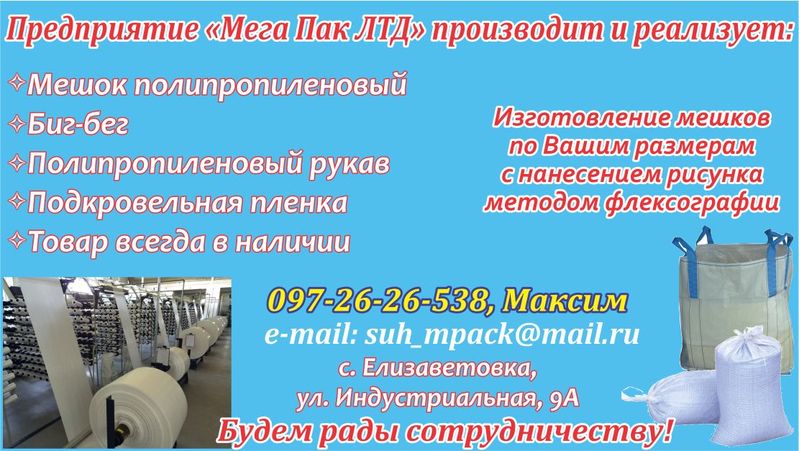 Продаем мешки, биг-беги и рукава полипропиленовые любых размеров. Доставка по Украине, любая форма оплаты. Мы - завод-производитель, ООО "Мега Пак ЛТД". |