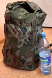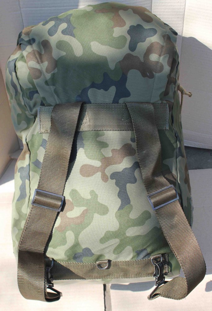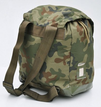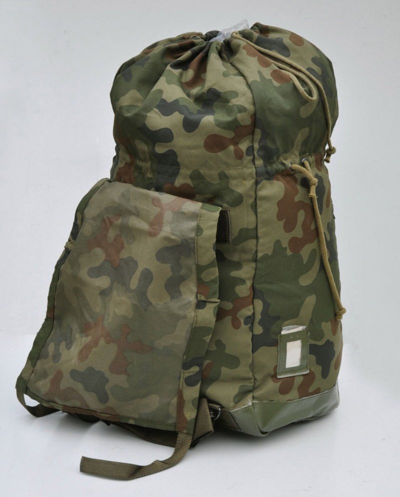 Рюкзак тактический изготовлен по заказу для армии Польши из специального влагоотталкивающего материала. Имеет усиленное водонепроницаемое дно из ПХВ и широкие плечевые лямки, регулируемой длины шириной 5 см, с металлической фурнитурой. В рюкзаке есть расширитель с помощью которого можно увеличить его объем до 50 литров.