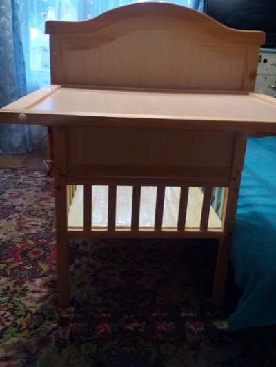 С торцевой стороны прикреплен пеленальный столик. Он небольшой, для деток где-то до 2-3 мес. Можно затем использовать, как столик для разных мелочей. Если столик не нужен, то его можно снять.