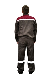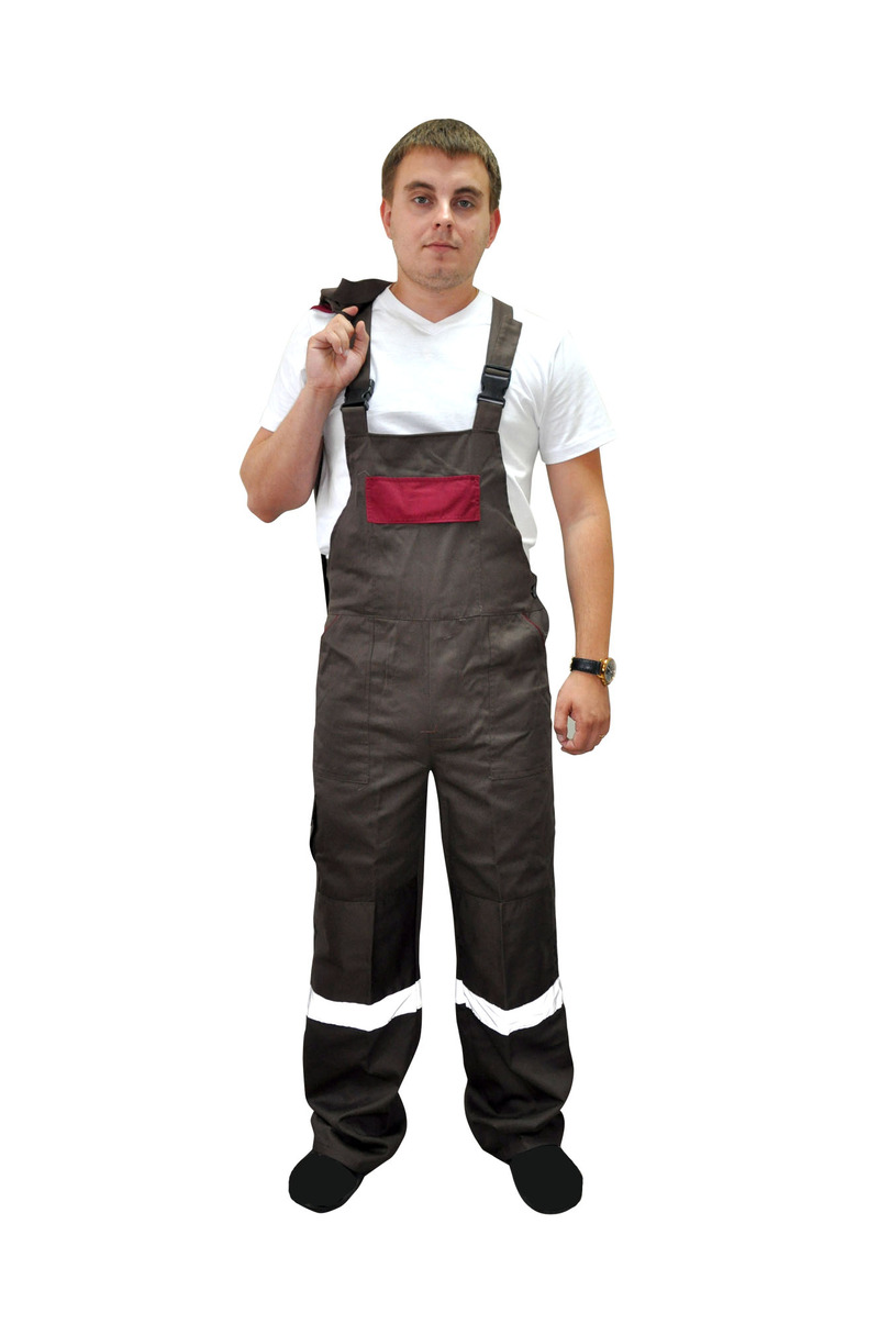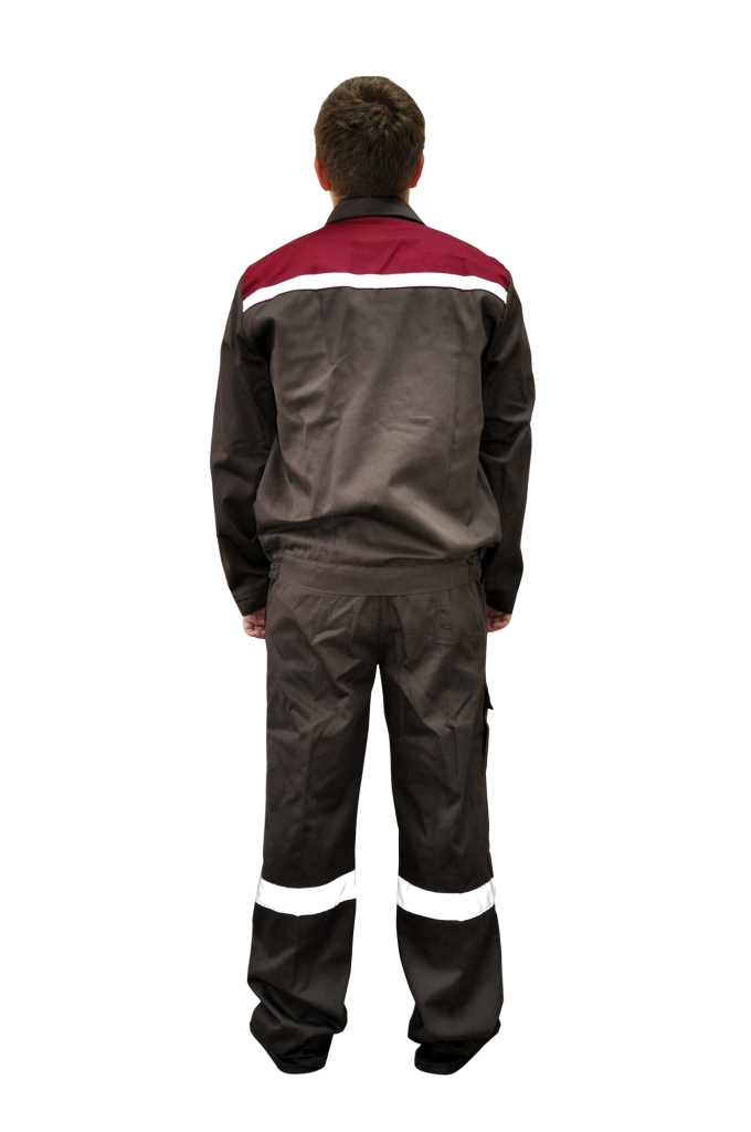 Костюм состоит из куртки и полукомбинезона . Комбинация цвета на куртке и полукомбинезоне - Коричневый и бордовый . Материал - ткань Саржа( повышенная прочность ткани ) плотность 245грм – состав хлопок 40 %