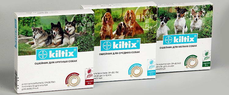 Средство борьбы с эктопаразитами собак представляет собой поливиниловую ленту желтого цвета, содержащую в качестве действующих веществ пропоксур и флуметрин. Выпускают ошейник Килтикс: