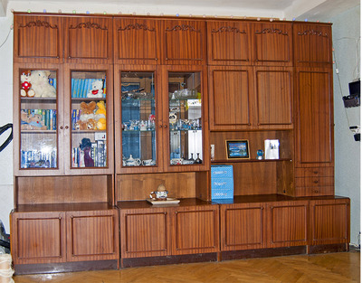 Шкаф для хрусталя: 88см*100см*36см. Задняя стенка зеркальная. Внутреннее пространство разделено 2 части. Полка стеклянная.