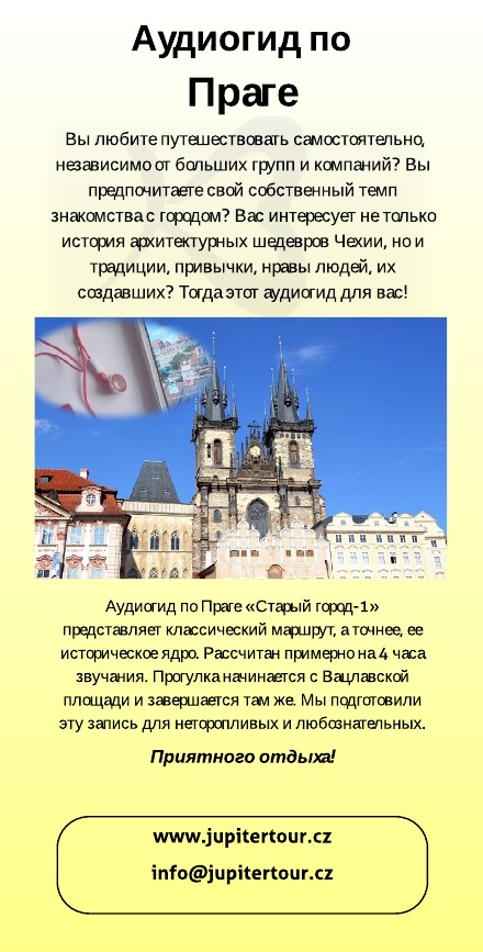 Планируете отдых в Чехии, но не любите торопиться и ходить с группами? Думаете о том, что посмотреть в Чехии самостоятельно и реально ли это? Тогда поездка в Чехию самостоятельно с нашим аудиогидом для вас! Аудиоэкскурсии в мp3 формате включают самые известные достопримечательности Чехии, что позволит превратить Ваше путешествие по Чехии в приятный и незабываемый отдых. Благодаря аудиозаписям Вы сможете познакомиться не только с Прагой, но и с другими городами. Сайт предоставляет полезную информацию о государстве, различных вариантах самостоятельного отдыха. Юпитер Тур Вам поможет спланировать путешествие в Чехию и приноровиться к вашему темпу. |