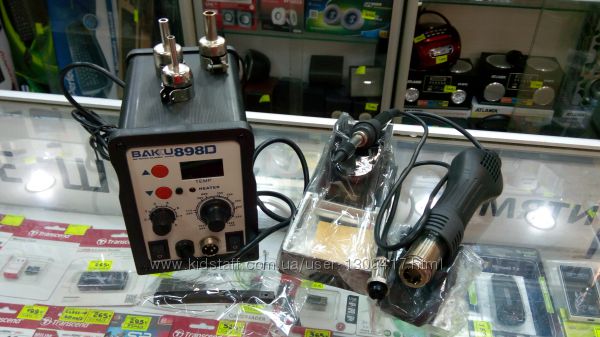 Паяльная станция Термовоздушная конвекционная BK-898D Baku BK-898D Паяльная станция Опт и розница Доставка по Украине Тип нагрева: периодический Компактная универсальная паяльная станция с цифровым управлением. Трехзначный светодиодный индикатор для отображения температуры фена. Продам отличную паяльную станцию BAKU 898D относится к категории 2 в 1, сочетает в себе возможность пайки нагретым воздухом и обыкновенным паяльником. Не заменимая вещь в арсенале мастера ! Она имеет современный дизайн и эргономична в использовании, компактна, универсальна, имеет цифровое управление. Станция имеет трехзначный светодиодный индикатор для отображения температуры нагретого воздуха. Управление температурой происходит с помощью замкнутой системы датчиков, микроконтроллер обеспечивает стабильность температуры. Большая стартовая мощность, быстрый разогрев, стабильность температуры с точностью до 1°С, на которую не влияет объем выдуваемого воздуха, делают пайку и демонтаж безопасными для таких чувствительных компонентов, как SOIC, PLCC, QFP, BGA и т.д. - Температура легко регулируется и достигает установленного уровня всего за 5 - 7 сек. - Уникальная функция неактивного состояния позволяет экономить энергию. Когда фен устанавливается в держатель, система приводится в дежурный режим, в котором станция снижает температуру. Как только фен снимается с держателя, система возвращается к установленным настройкам. Продолжительный продув воздухом (система охлаждения) после выключения прибора продлевает срок эксплуатации нагревательного элемента. Высокопроизводительный нагнетатель турбинного типа обеспечивает поступление большого воздушного потока при малом шуме. Контактная пайка так же легка и удобна. Эргономичный паяльник имеет аналоговую настройку с высокой точностью, нагревательный элемент высокоэффективен и надежен. Паяльная станция BAKU 898D универсальна в своем применении, с ее помощью можно паять практически любые электронные компоненты. Она компактна и эргономична, и послужит хорошим рабочим инструментом в экономичном классе. Паяльная станция BK-898D - термовоздушная бескомпрессорная паяльная станция с цифровой регулировкой температуры термофена. Температура паяльника выставляется с помощью вращающегося переключателя и контролируется загоранием светодиода. Компактность станции достигнута благодаря отсутствию нагнетательного шланга. BK-898D отлично подходит для ремонта небольшой электроники (мобильные телефоны, видеокамеры и т.д.), бытовой техники. Керамический нагревательный элемент с интегрированной термопарой, которым оснащена станция BK-898D, предотвращает возможную подачу напряжения на элементы пайки. Независимая регулировка температур фена и паяльника. Цифровая индикация температуры воздушного потока позволяет достичь максимальной точности при работе с техникой. В комплекте поставки паяльной станции BK-898D предусмотрено долговечное хромированное жало - конус с торцом 0,4 мм. Совместимость паяльных жал с системами HAKKO и XYTRONIC обеспечивает широкий выбор жал. Компактный дизайн Быстрый разогрев Цифровая индикация фактической температуры потока горячего воздуха для термофена Широкий диапазон рабочих температур Керамический нагревательный элемент паяльника позволяет избежать поражения электронных компонентов напряжением Уникальн