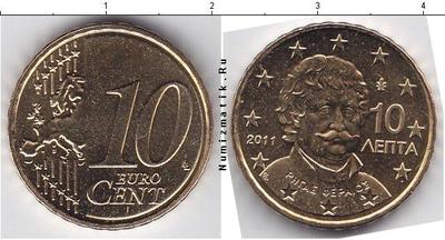 Монеты Греции номиналом 10 евроцентов введены в обращение в 2002 году. Выпускаются на монетном дворе Греции, за исключением 2002 года, когда монеты евро также чеканились в Испании, Франции и Финляндии. В этом случае на одной из звезд Евросоюза, расположеных по окружности монеты, указывался знак соответсвующего монетного двора. Выполнены по дизайну Georges Stamatopoulos. На аверсе монеты 10 евроцентов Греции изображен портрет Ригаса Фереоса — греческого революционного поэта и национального героя, одного из первых представителей греческого Просвещения. |