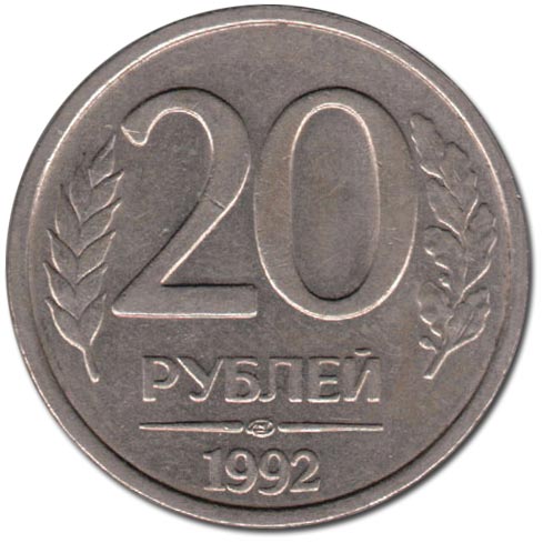 20 рублей - впервые появившийся в российском денежном обращение номинал. В настоящее время 20 рублей 1992 года встречаются несколько реже чем более мелкие номиналы этого года, цена монет московской и ленинградской чеканки примерно одинакова. |