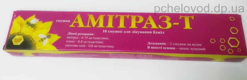 Для Бджіл. Листівка-вкладка препарату «Амитраз-Т» смужки для бджіл Опис: Цупкі смужки із шпону лущеного. Склад: Одна смужка містить діючі речовини: амітраз – 6.75 мг, тімол – 0.80 мг, пихтова ефірна олія – 0.80 мг. Фармакологічна дія: Діючі речовини, – амітраз, тімол, пихтова ефірна олія проявляють селективну дію на ектопаразитів та взаємодіють з натрієвими канальцями мембран нервових клітин, в результаті чого спостерігається затримка реполяризації мембрани. |
