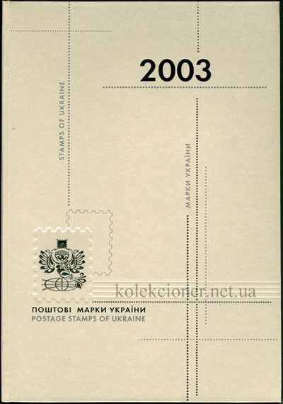 Ілюстрований річний набір - книга почтових марок України 2003 р. В книзі представлено та описно 65 марк. Кількість сторінок 71. Книга на українській та англійській мовах. |