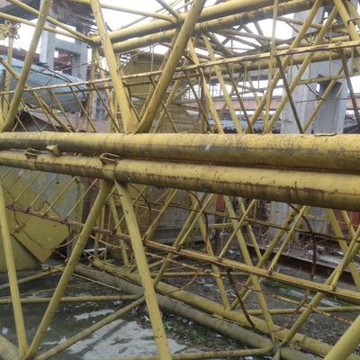 КБ-405 — модельный ряд самоходных башенных кранов 4-й размерной группы (по грузовому моменту) на рельсовом полотне, с поворотной башней и подъёмной (наклонной) стрелой. Краны предназначены для производства строительно-монтажных работ жилых и административных зданий и сооружений высотой до 16 этажей и с массой монтируемых элементов от 9 до 10 т (в зависимости от исполнения). Для обслуживания здания с нескольких сторон, кран может передвигаться по рельсам с криволинейными участками, при радиусе кривизны внутреннего рельса 7 м. Особенность конструкции крана — вылет стрелы может меняться краном её подъёмом, с подвешенным грузом на крюке.Кран демонтирован и готов к погрузке |