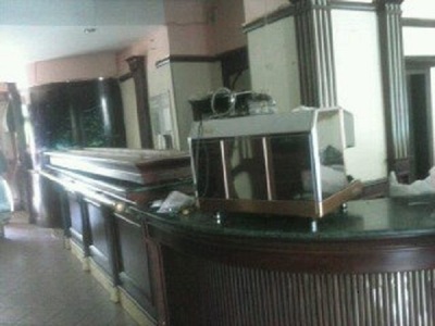 Барная стойка укомплектована: мраморная столешница, холодильный стол с двумя мойками и 4 ящика, холодильная кондитерская витрина, подвес для бокалов, зеркала. Размер около 12 м.