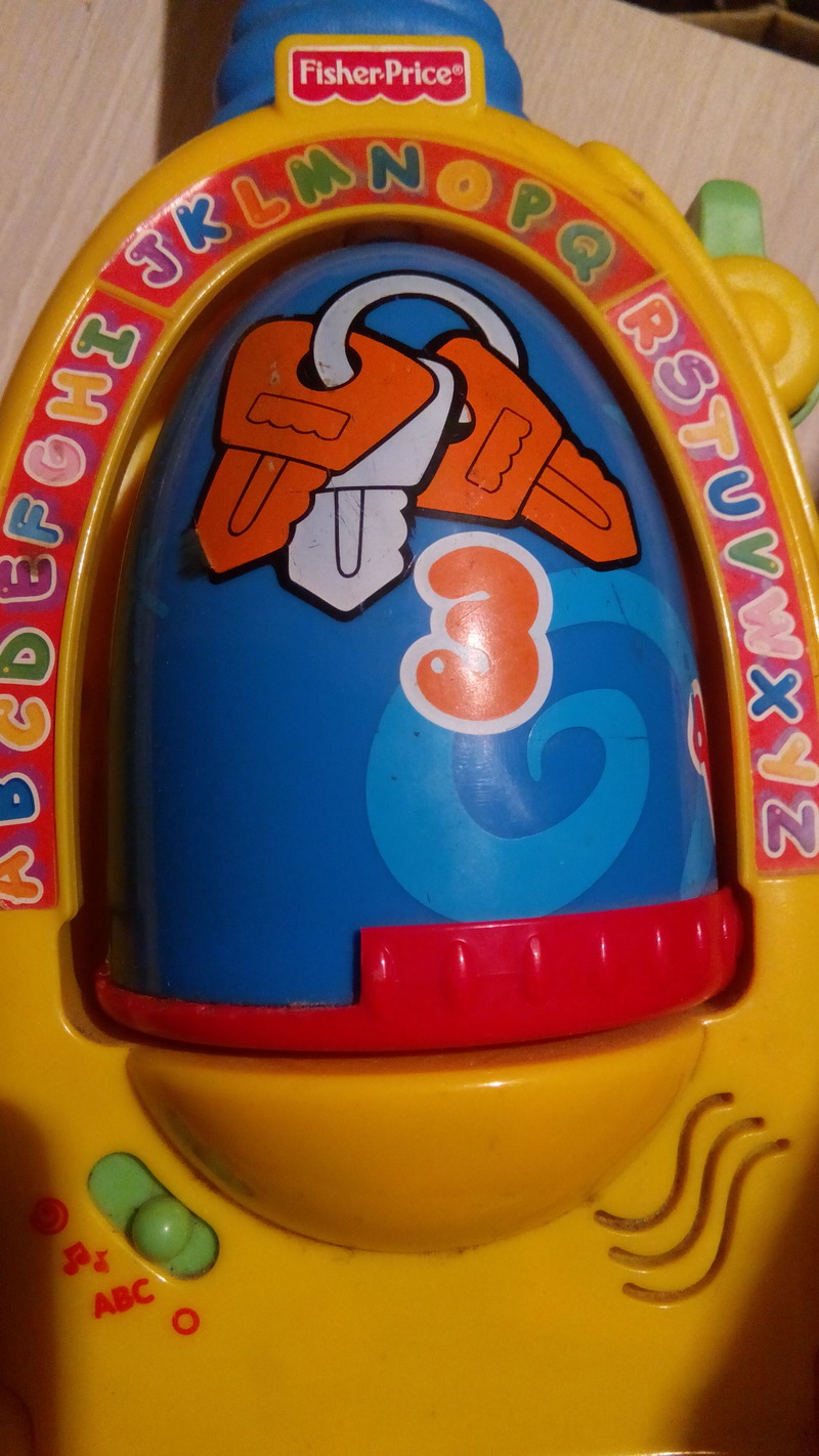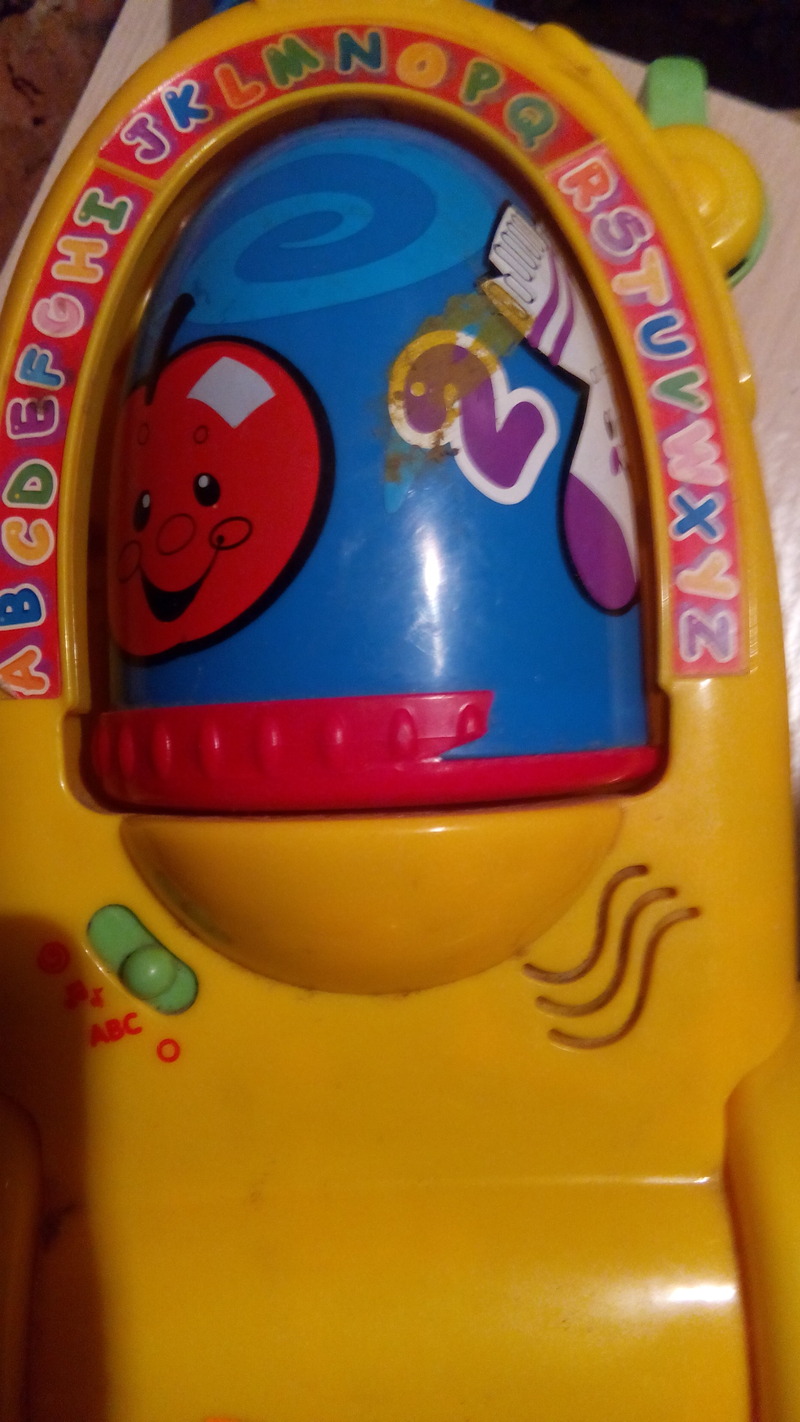 Вигляд, як на фото. Музика працює. Говорить англійський алфавіт Розпродаж. вертушка сломана - смотрели, пластик сломан на котором она крутится и часть сломана ободка на вертушке, он красный. Пишу так как оно есть. |
