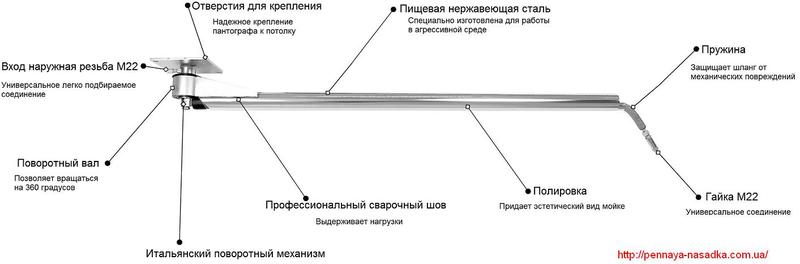 Технические характеристики: • Длина – 2 м/ 1,65 м/ 1,8 м • Рабочее давление – 250 бар • Рабочий радиус - 360⁰, позволяет мыть авто со всех сторон • Материал – полированная нержавеющая сталь • Крепление – потолочное или настенное • Вход (папа) – М22х1,5 наружная (универсальный разъем, который подходит практически для любой мойки) • Выход (мама) – гайка М22х1,5 внутренняя (универсальный разъем, который подходит практически для любой мойки).
