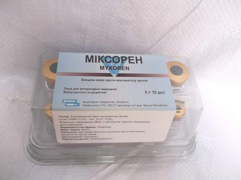 Одна доза для подкожного использования – Poxvirus myxomatosae attenuatum мин. 0,2 * 104TCID50, культивированная среда MEM, лиофилизированная среда.