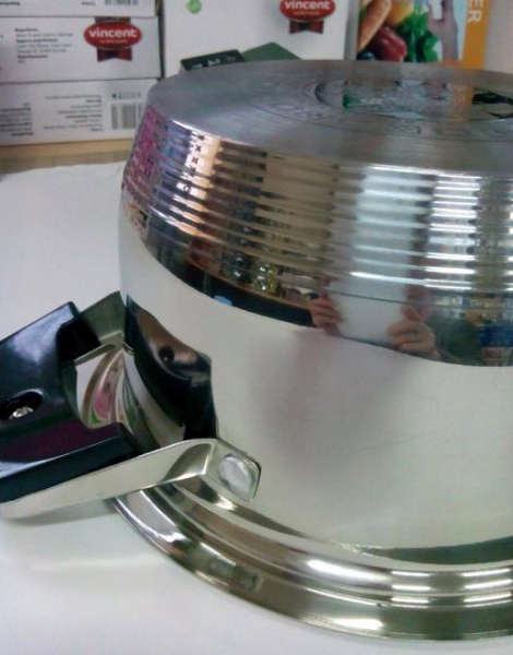Таким же набором одним пользуемся дома: посуда тяжелая, ручки не нагреваются, термодатчик работает отлично и очень удобно (главное не ронять крышки), температуру держат долго (если нужно чтобы быстрее остыло, приоткройте крышку), можно готовить как в пароварке.