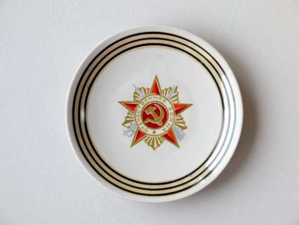 Декоративная тарелка "Орден "Отечественная война". Фарфор, цветная надглазурная печать. Коростенский фарфоровый завод. СССР, вторая половина ХХ века. Диаметр 17 см. Красное надглазурное клеймо. Сохранность хорошая. В наличии 150 шт. От 10 шт. - цена 100 грн |