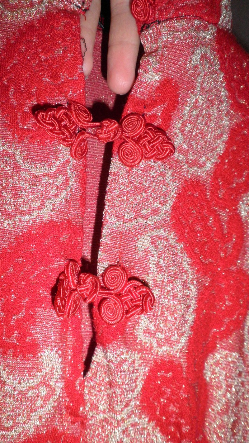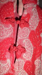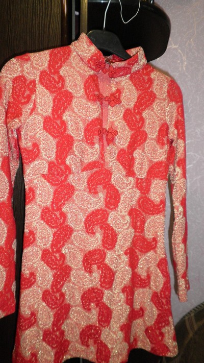 из плотноко кребдышина, тянеться с люрексом, на Нг то что нада!Коротенькая, красного цвета и узор очень блестит, на фото не видно, смотриться очень богато, Все узоры просто сверкают, фото не показывает, платье как бы красное, в жизни, но за щет блестящей структурнай нити, оно как теракотовое, я в нем на свадьбе сестры была, на столько нарядно выглядит..можно под шейку застегнуть будет под китайское платице, или растегнуть-декольте, очень эфектно смотриться с золотыми лосинами, просто бомба!есть широкий блестящий пояс (подарю), на вешалке смотриться безформенно, но поверте по фигуре очень женственно лежит...красиво на брюки, под пояс или так... |