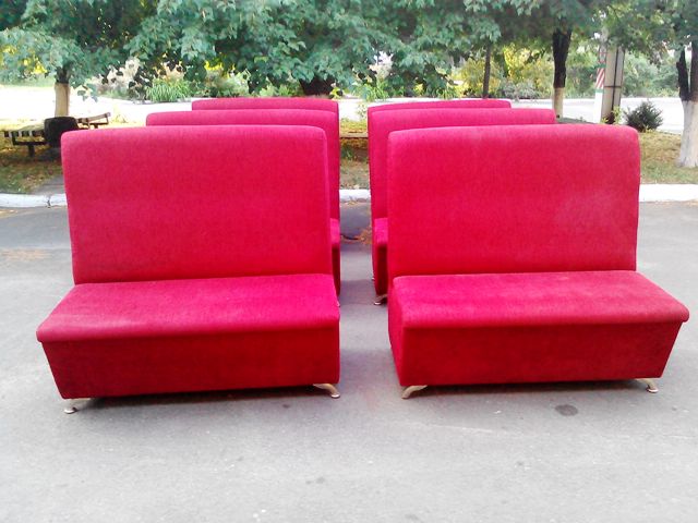 Столы для кафе бу из дуба, к столу прилагается две металлические ножки; Диваны для кафе бу, ткань, хорошее состояние. |