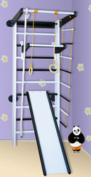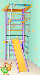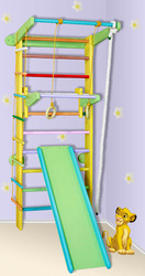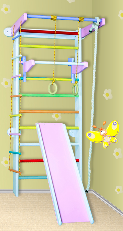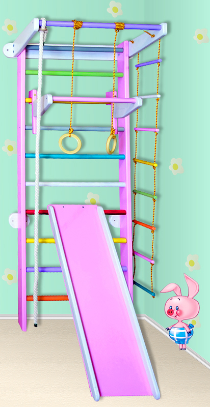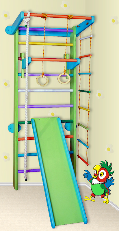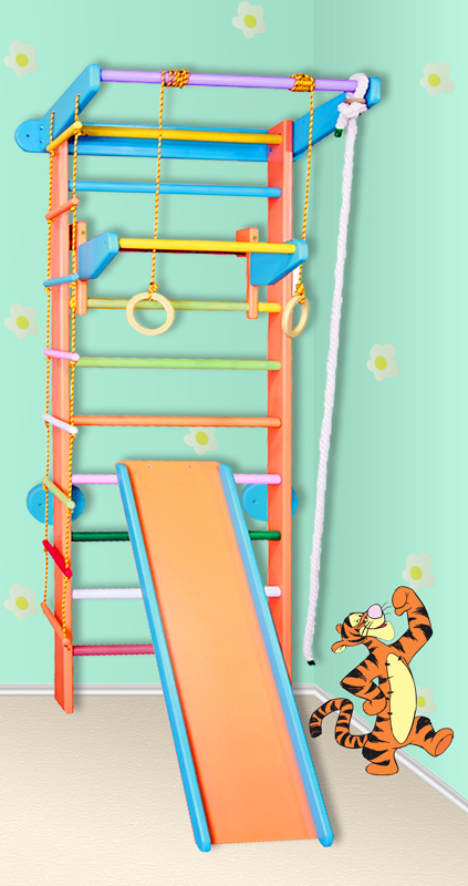 Функциональный и красивый спортивный уголок из массива сосны с буковыми перекладинами на основе шведской стенки, оборудован турником и навесными элементами для детей: доской-горкой, турничком и веревочным набором, состоящим из лесенки, колец и каната.