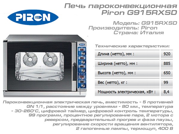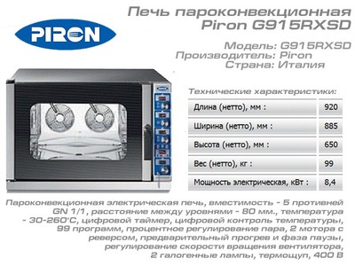 Продам новый пароконвектомат Piron G915RXSD (Италия) вместимость - 5 противней GN 1/1, расстояние между уровнями - 80 мм.,цифровой таймер, цифровой контроль температуры на 30-260*С , 99 программ, процентное регулирование пара, 2 мотора с реверсом, предварительный прогрев и фаза паузы для приготовления заготовок продукции, регулирование скорости вращения вентилятора, 2 галогенные лампы, термощуп для определения готовности продукции.Данный пароконвектомат предназначен для приготовления гастрономии и кондитерских изделий в ресторане, кафе, баре, кофетериях.