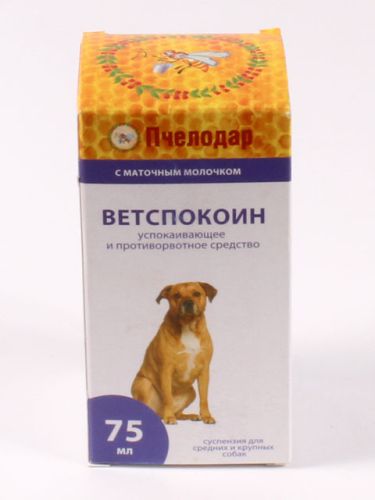 Ветспокоин с маточным молочком успокаивающее и противорвотное лекарственное средство на основе фенибута, прометазина и натурального пчелиного маточного молочка, обладающее мягким седативным, спазмолитическим, противосудорожным, анксиолитическим, стрессопротекторным, адаптогенным действием. Длительность терапевтического курса составляет 10-15 дней в зависимости от состояния животного и индивидуальных особенностей организма. Для снижения повышенной половой активности препарат рекомендуется применять одновременно с гормональными контрацептивными средствами для животных. С целью профилактики стресса препарат назначают за 2 - 3 дня до мероприятия. Для профилактики укачивания и как противорвотное, назначают однократно за 1-2 часа до транспортировки.