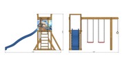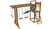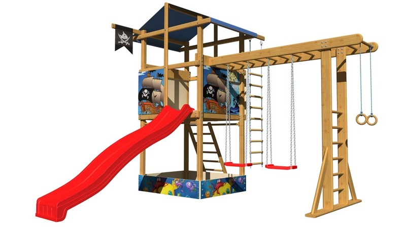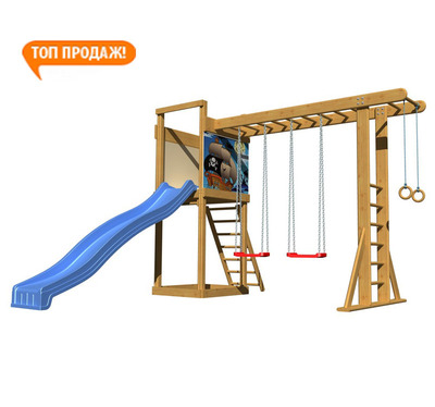 Детям понравится играть и заниматься спортом, кататься на качелях и на длинной высокой горке, заниматься на кольцах и турнике, а также лазать по лестницам. Конструкция изготовлена из сосны, покрытой для долговечности водоэмульсионной краской.