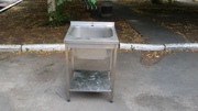 Мойка из пищевой стали 600*600*850/300 с бортом и одной полкой. Используется на кухнях общественного питания. Поскольку мойка штампованная, сварных швов на чаше нет, что продлевает срок эксплуатации. |