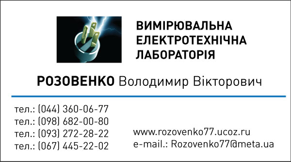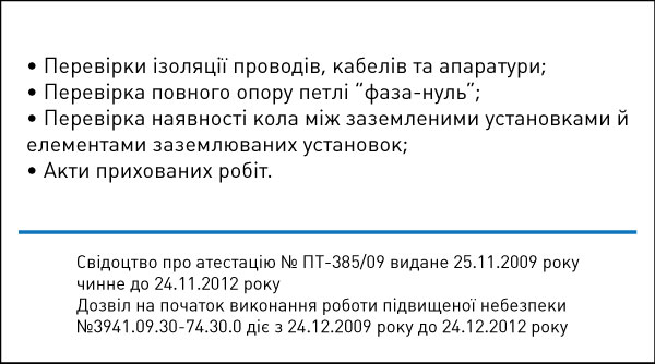 Требования к электротехнической продукции и эксплуатации электроустановок Согласно требований украинского законодательства, любая выработанная продукция, если она может причинить вред здоровъъю человека, в том числе и электротехническая, должна обовъъязково проверяться и проходить аттестацию в специальных лабораториях. Все электроустановки (смонтированные или реконструированные) согласно Правилам Установки Электроустановок (ПУЕ) и Правилам Технической Эксплуатации Электроустановок Потребителей поддаются регламентированным электрическим испытанием. В своей деятельности мы индивидуально подходим к каждому клиенту, соответственно и цена на наши услуги непосредственно зависит от объъему работ на объекти.