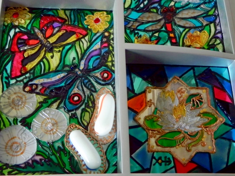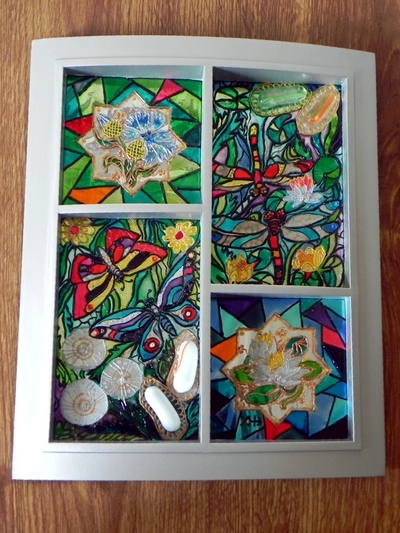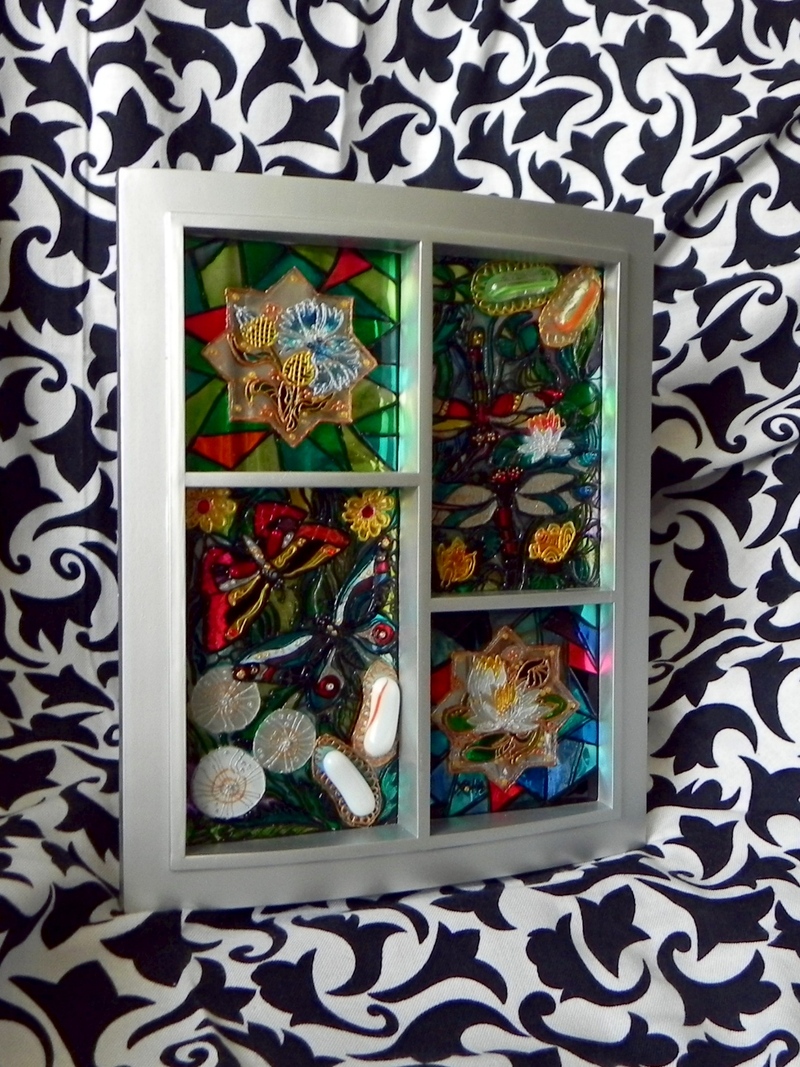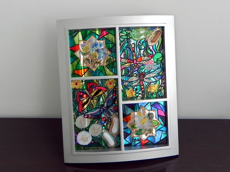 Необычная четырех-секционная композиции на тему симбиоза Трепетного и хрупкого Мира: воды и земли. Цветы.Бабочки.Стрекозы... Витражная картина выполнена витражными красками и контурами по стеклу. В композиции применены разноцветные стеклянные элементы и бисер. Необычное фольгированное стекло-основа даёт восхитительный оптический эффект яркого блеска изображения в отражённом свете! Любителям фэнтези и Природы будет хорошим и нетривиальным подарком эта картина. Серебристая объемная рамка с отдельными секциями определила и сюжет и композицию картины.Изготовление за 7 дней на заказ. Новая работа при повторе оригинала может быть чуть отличаться в мелких деталях только в лучшую сторону. Доставка- Новая почта или самовывоз.