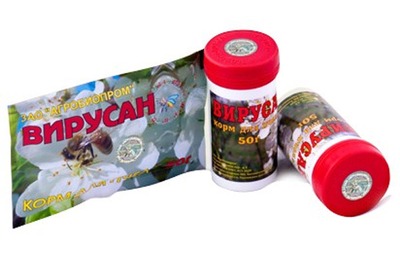 Дозы и способ применения: Препарат «Вирусан» применяют пчелам в смеси с сахарным сиропом с целью профилактики и лечения вирусных болезней, весной (апрель-май) и в конце лета (август-сентябрь) в период наращивания силы семей перед главным медосбором, при недостаточном пыльцевом взятке или недостаточных запасах перги в ульях и подготовки их к зимовке. Препарат растворяют в теплом (35-40С градусов) сахарном сиропе, приготовленном в соотношении 1:1, из расчета 50 грамм препарата «Вирусан» на 10 литров сахарного сиропа. Приготовленный сироп разливают в верхние ульевых кормушки из расчета 1 литр сиропа на одну семью и применяют 2-3 раза с интервалом 2-3 дня.