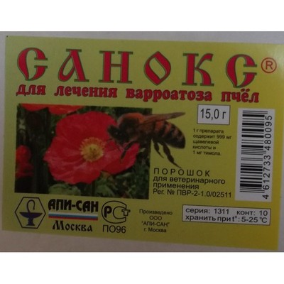 Самыми ярым паразитом и врагом пчел считается клещ варроа. По сей день это самая актуальна проблема пчеловодства. Проводя научные исследования, компания Апи-Сан выпустила препарат Санокс, который изготовлен на основе самых эффективных компонентов. В состав Санокса входят тимол и щавелевая кислота, которая эффективно уничтожает клеща варроа. Помимо этих ингредиентов, в состав Санокс входит много солей и щелочных металлов, которые обладают высокой химической активностью. Препарат изготовлен на дистиллированной воде, или кипяченой водопроводной.