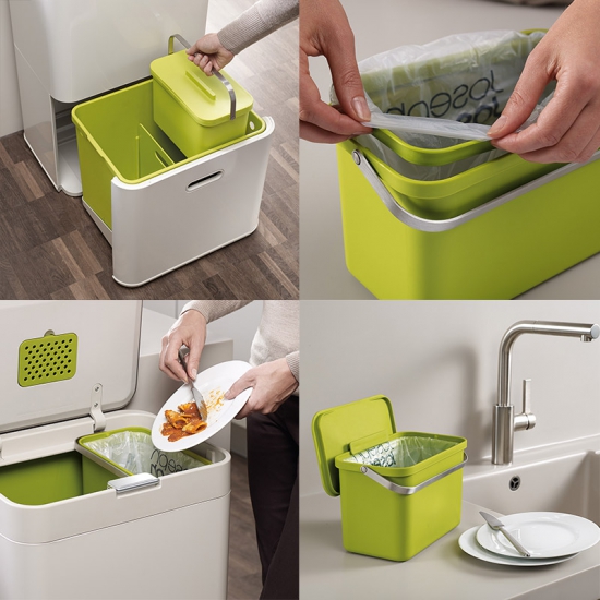 Контейнер Intelligent Waste Totem создан для правильной сортировки мусора таких как стекло, пластик, пищевые отходы). Нижнее отделение, объем которого 14л, предназначено для хранения всевозможных хозяйственных принадлежностей (например, пакетов и чистящих средств). Объем основного отделения составляет 36л, а съемный контейнер (4 л) предназначен для пищевых отходов. На крышке контейнера расположен фильтр, который удерживает в себе запахи. Открыть основное отделение можно легко, нажав на кнопку. Контейнер удобно перемещать по любой поверхности, поскольку он оснащен ручкой и специальными колесиками.