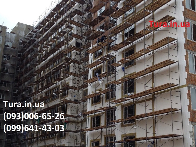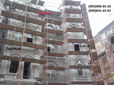 Леса строительные (рамного типа облегченные, полимерная покраска) . Строительные леса нашего производства наращиваются на высоту 40м. При этом габариты секции составляют 2м-высота, 3м-ширина, 1м-глубина. Максимальная нагрузка на настил составляет 200кг/кв.м. В постройке конструкции строительных лесов используются следующие элементы: