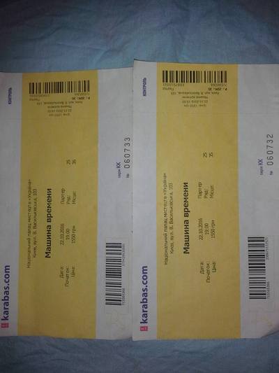 Продаю 2 билета на концерт в Киеве МАШИНА ВРЕМЕНИ. ДАТА 22.10.2016. Цена будем торговаться |