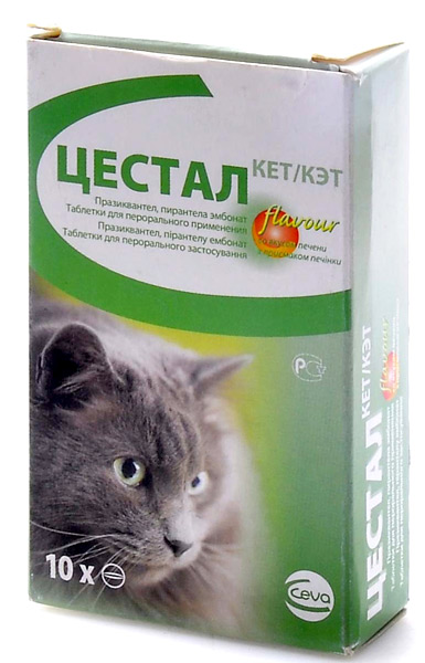 Цестал Кэт (Cestal Cat) – антгельминтный препарат, содержащий в качестве действующих веществ в одной таблетке 20 мг празиквантела, 230 мг пирантела памоата, а также вспомогательные компоненты: лактозу, картофельный крахмал, желатин, тальк, магния стеарат, натрия карбоксиметиламило-пектин. Цестал Кэт представляет собой круглые плоские таблетки светло-желтого цвета с разделительной бороздкой по центру. Масса одной таблетки 350 мг. Препарат расфасовывают в блистеры по 2 таблетки из алюминиевой фольги и прозрачной полиэтиленовой пленки и упаковывают в картонные коробки по 10 таблеток в каждой. Каждую упаковку маркируют с указанием названия и назначения препа-рата, фирмы-изготовителя, номера серии, срока годности и снабжают Временным наставлением по применению.