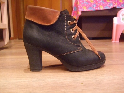 полуботинки осенние, черные с рыжим верхом. натуральный нубук. размер 36. стельку сложновато померять но примерно 23,5 см. Каблук 8 см, но есть еще платформочка 1,5 см. Внутри текстильная шерстяная подкладка. Состояние нормальное (видно что носились, но сдертых носов или сдертой кожи нету. Набойки не стерты. На узенькую ножку. польская фирма BUT S. Доставка новой почтой, укр почтой, интайм (Б/У) |