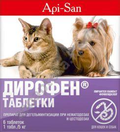 Фармакологическое действие. Дирофен обладает широким спектром антигельминтного действия на все стадии развития круглых и ленточных гельминтов, в т. ч. Toxocara canis, Toxocara mystax, Toxascaris leonina, Trichuris vulpis, Uncinaria stenocephala, Echinococcus granulosus, Echinococcus multilocularis, Mesocestoides lineatus, Taenia spp., Dipylidium caninum, Diphyllobothrium latum, Multiceps multiceps, паразитирующих у собак и кошек. Механизм действия входящих в состав препарата фенбендазола и пирантел тартрата основан на угнетении ферментов, повреждении оболочки мышечной ткани, деполяризации нейромышечных ганглиев гельминта, что приводит к нарушению нервно-мышечной иннервации, параличу, гибели паразита и способствует его выведению из желудочно-кишечного тракта. Дирофен относится к группе умеренно токсичных для теплокровных животных препаратов, в рекомендуемых дозах не оказывает эмбриотоксического, тератогенного и сенсибилизирующего действия. Хорошо переносится собаками и кошками различных пород и возрастов.