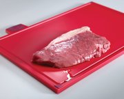 Красная - для сырого мяса (сок не вытечет за пределы доски из-за борозды)