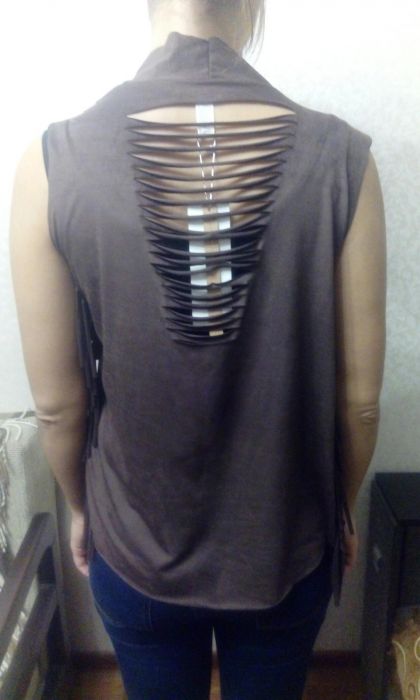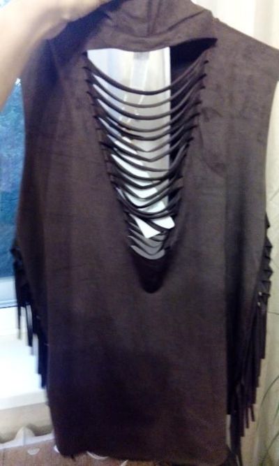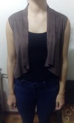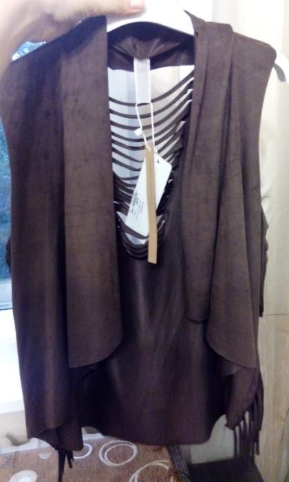 Очень классная жилетка израильского бренда twenty six, шоколадного цвета, очень приятный на ощупь материал, с бахромой. Размер М. |