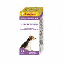 Ветспокоин с маточным молочком успокаивающее и противорвотное лекарственное средство на основе фенибута, прометазина и натурального пчелиного маточного молочка, обладающее мягким седативным, спазмолитическим, противосудорожным, анксиолитическим, стрессопротекторным, адаптогенным действием. Длительность терапевтического курса составляет 10-15 дней в зависимости от состояния животного и индивидуальных особенностей организма. Для снижения повышенной половой активности препарат рекомендуется применять одновременно с гормональными контрацептивными средствами для животных. С целью профилактики стресса препарат назначают за 2 - 3 дня до мероприятия. Для профилактики укачивания и как противорвотное, назначают однократно за 1-2 часа до транспортировки.