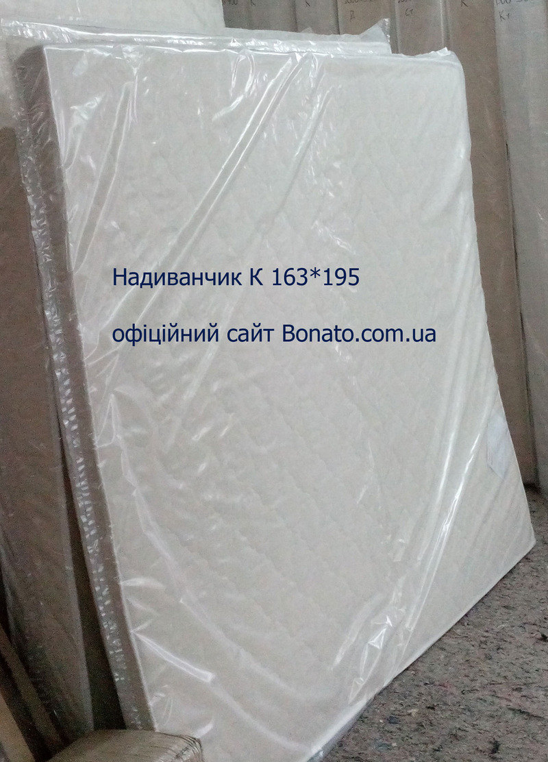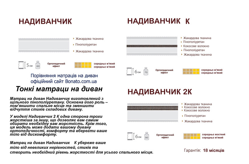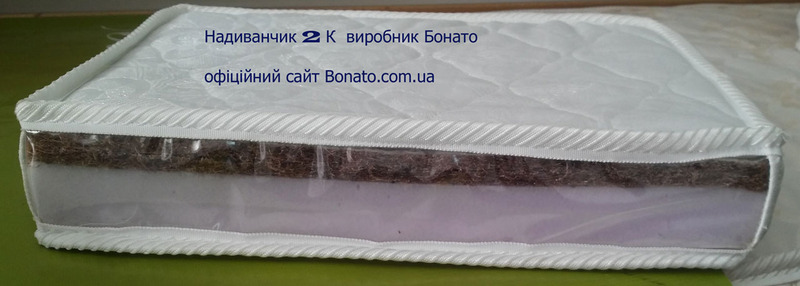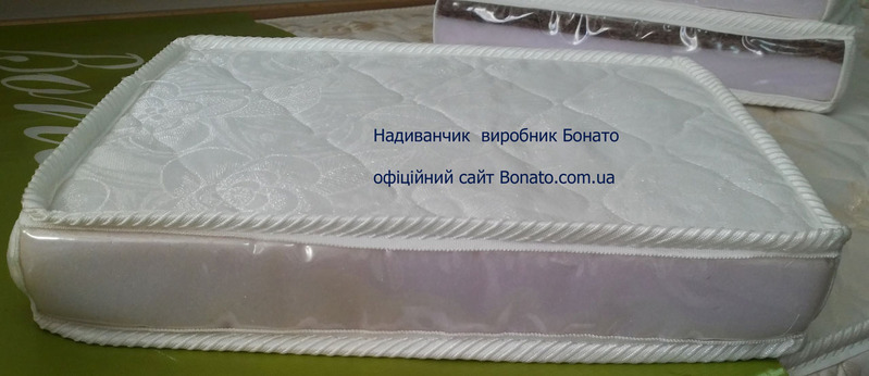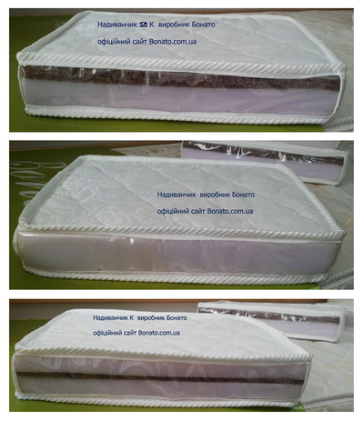 Підприємство виробник матраців пропонує виготовлення тонких матраців на дивани за індивідуальними розмірами. Найбільше користуються попитом 3 варіанти: 1. Повністю пінополіуретановий - надиванчик. Виготовлений з жорсткого пінополіуретану та обшитий жакардовим чохлом на замку (можна зняти та попрати). Купують, якщо потрібно пом’якшити спальне місце або додати йому відчуття комфорту. 2. Пінополіуретан, кокос, пінополіуретан – Надиванчик К. Виготовлений з 2 шарів жорсткого пінополіуретану, а між ними вкладено кокосове волокно. Кокос додає цьому тонкому матрацу витримки та допоможе згладити невеликі стики та нерівності Вашого дивану. Надиванчик К обшитий жакардовим чохлом на замку. 3. Подвійний кокос та пінополіуретан – Надиванчик 2К. Він має 2 різних жорсткості: одна сторона жорсткіша, а інша - середньої жорсткості. Надиванчик 2 К не лише допоможе забрати відчуття невеликих нерівностей дивану, а й дасть можливість Вам самостійно обрати більш підходящий рівень жорсткості та комфорту. Чохол із жакардової тканини на замку. Зверніть увагу, що жоден з цих матраців не передбачає щоденного закручування. А надиванчик К та 2К взагалі не бажано зкручувати, бо може заламатися кокосове волокно. Розрахувати вартість тонкого матраца на диван Ви можете на сайті http://bonato.com.ua/index.php?p=calc. Термін виготовлення до 5 робочих днів. За необхідності за доплату 10% можемо заокруглити край матраца, особливо це актуально для розкладних кутових диванів. Гарантія на тонкі матраци на диван – 18 місяців. Доставка в міста Львів, Київ, Житомир, Рівне, Дубно, Луцьк, Радивилів, Новоград-Волинський (замовлення від 1500 грн) безкоштовна. Можемо відправити тонкі матраци по Україні перевізниками Нова Пошта, Ін-тайм або Делівері з частковою або повною компенсацією вартості пересилки (залежить від вартості замовлення та міста куди здійснюється відправка). http://bonato.com.ua/