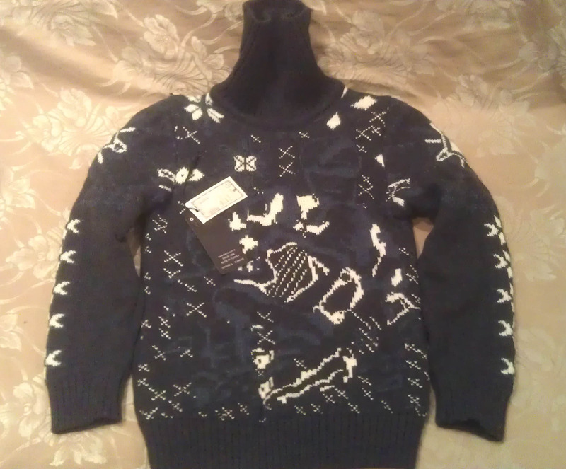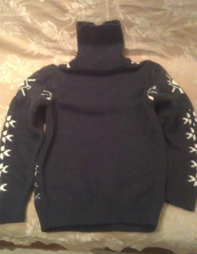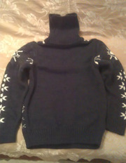 Очень тёплый, плотный свитер-гольф с лыжником и снежинками плечи: 38 см рукав: 63 см высота: 66 см ширина низа: 35 см |