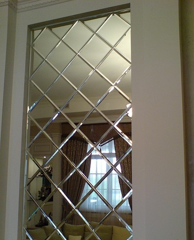 Зеркальное панно может выглядеть как зеркальная мозаика из маленькой плитки или же как большие зеркала с фацетом.