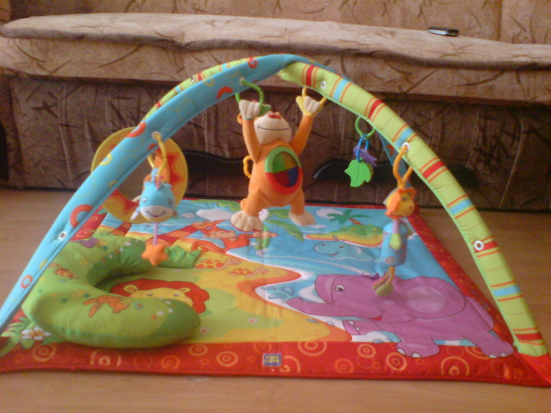 Детский развивающий коврик "МАРТЫШКИН ОСТРОВ" очень забавный, яркий, музыкальный. На коврике нарисованы зеленая травка, пальмы, веселые зверята: фиолетовый слоник, желтый львенок, 2 зайчонка. Посреди нарисованного моря плавает кит. На развивающем коврике нашита тканевая шелестящая зеленая травка. Ребенок сможет пощупать, пошелестеть и конечно же попробовать на вкус J . Под травкой прячется черепашка. В черепашки спрятана пищалка. На небе можно дотронуться к маленькому, мягкому, приятному на ощупь облаку. В комплект к развивающему коврику входит мягкая подушка. На подушке ребенку будет удобно путешествовать по острову на животике. На дугах детского коврика подвешены забавные и веселые погремушки: лев, вибрирующий китенок со звездочкой, пластмассовые и тканевые листики. Но самый интересный обитатель этого чудного развивающего коврика – Обезьянка. Она играет три мелодии,может крепиться двумя лапками за дуги коврика. Малыш подрастет, коврик не будет ему таким уже интересным, а вот мягкая игрушка – Обезьянка станет любимой игрушкой малыша на долгое время.