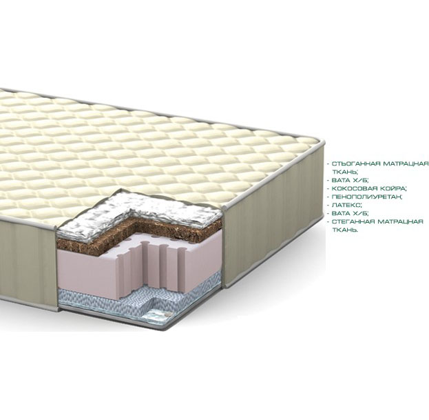 Состав матраса: стеганная матрацная ткань, вата х/б, кокосовая койра, пенополиуретан, кокосовая койра, вата х/б, стеганная матрацная ткань