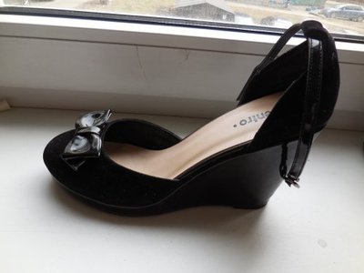 Туфельки очень красиво выглядят на ножке, состояние идеальное, обувались 2 раза. Размер - 38,5 Стелька - 25 см., танкетка - 9 см. Искусственная замша. |